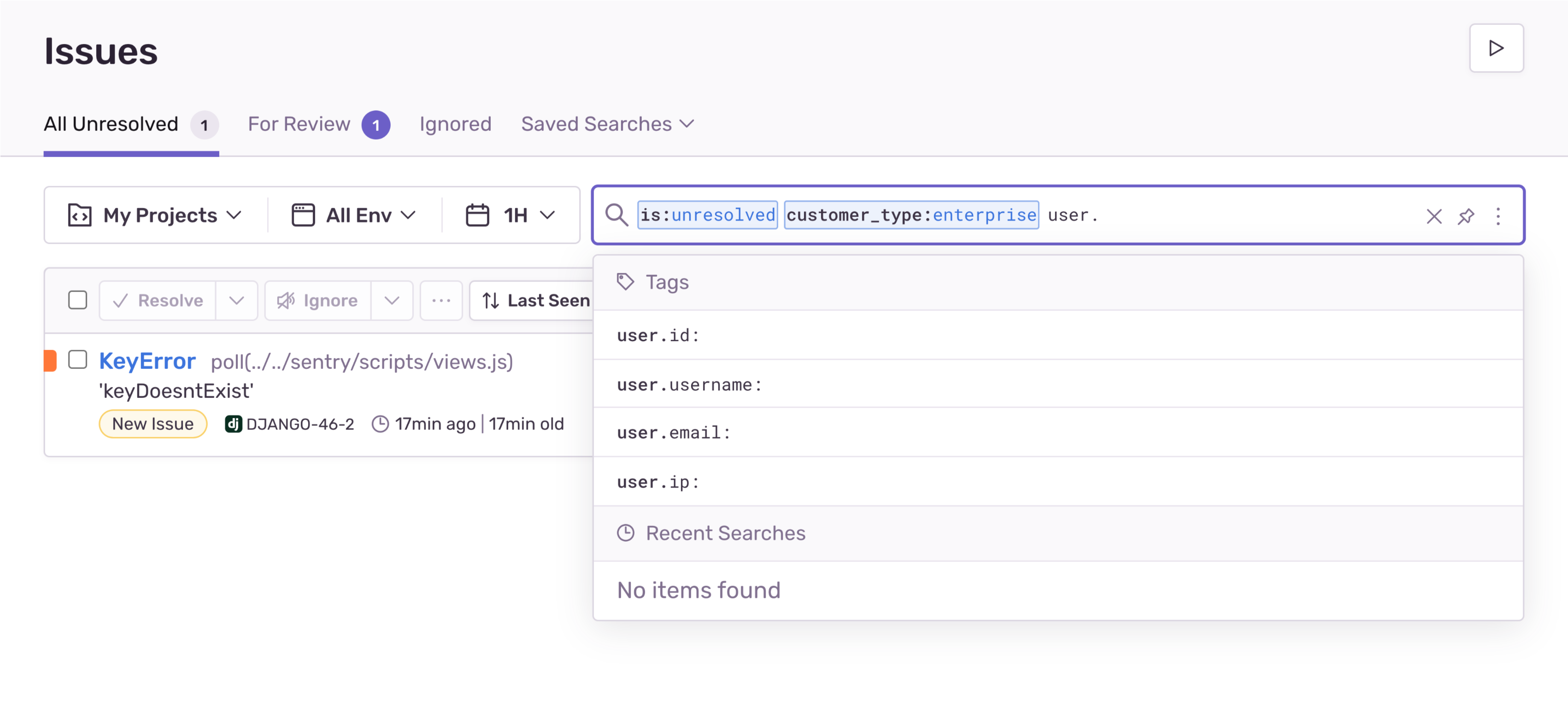 custom tags,user contextattributes, andreleaseids in the issue search bar.