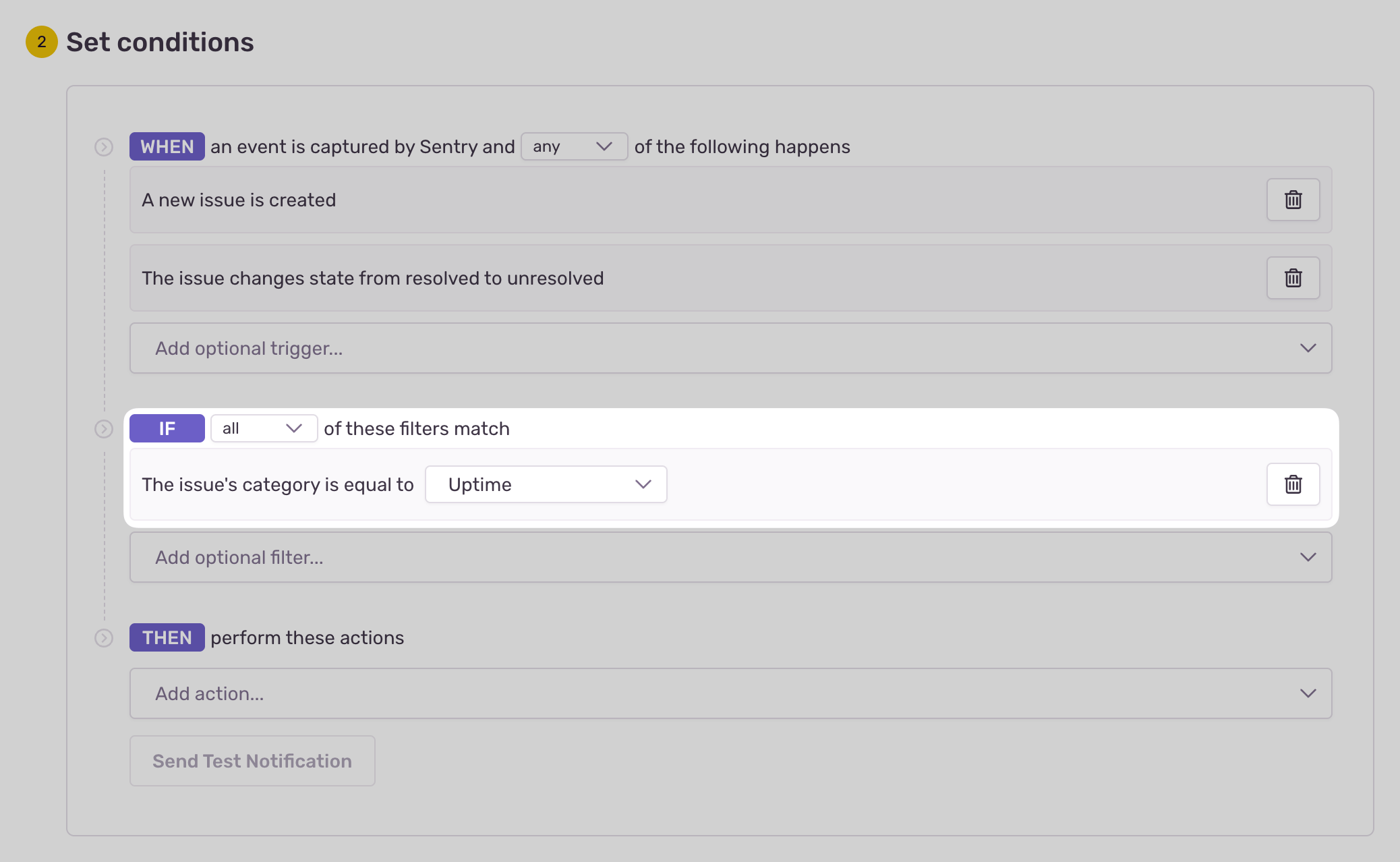 To start getting notifications for a new downtime issue, configure an issue alert and choose the issue category "uptime". Then choose how you'd like to be notified (via email, Slack, and so on).