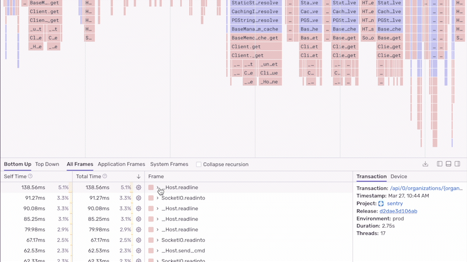 Profiling data can be used to gain insight into what methods and lines of your code are slow. Each profile has a detailed view that gives information about what happened in your code while the profile was collected and offers different ways to explore your profile data. This information can be found by going to the Profiling page in sentry.io, clicking on a “Transaction” and then selecting a “Profile ID.”
